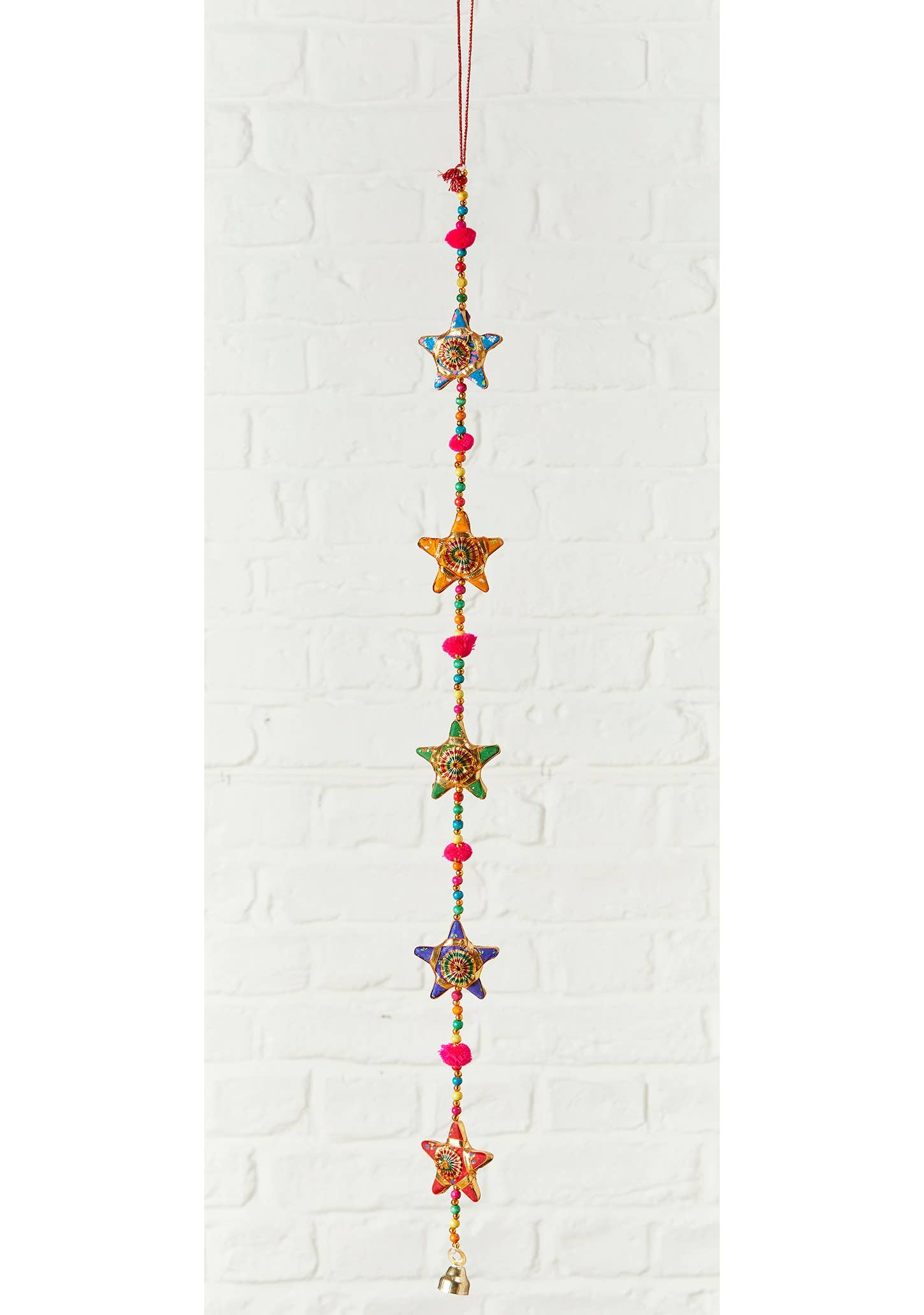 A traditional handmade Indian hanging decoration of gold embellished stars. Connected by delicate beads, and red pom-poms, and finished with a lucky bell. This is a unique cultural decoration for a gift, welcome feature or to celebrate a special occasion. Due to the hand crafted nature, there may be slight design variations in these exclusive pieces.