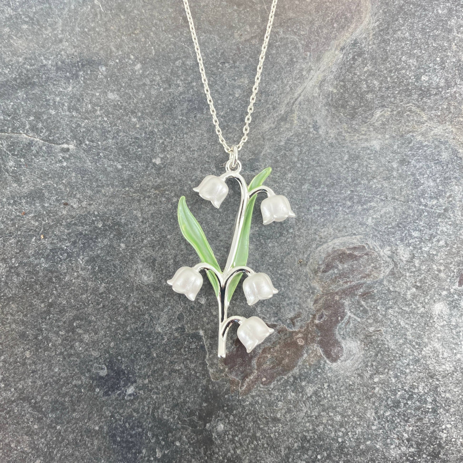 Lily of The Valley hand enamelled silver-plated charm pendant necklace. Our beautiful pendant embodies nature with its intricate design and attention to detail. The pendant is on a 41cm chain, with a 7.5cm extension chain and lobster clasp. The lily of the valley flower represents purity, motherhood, sweetness, 2nd wedding anniversary, May birth month and makes a special gift.